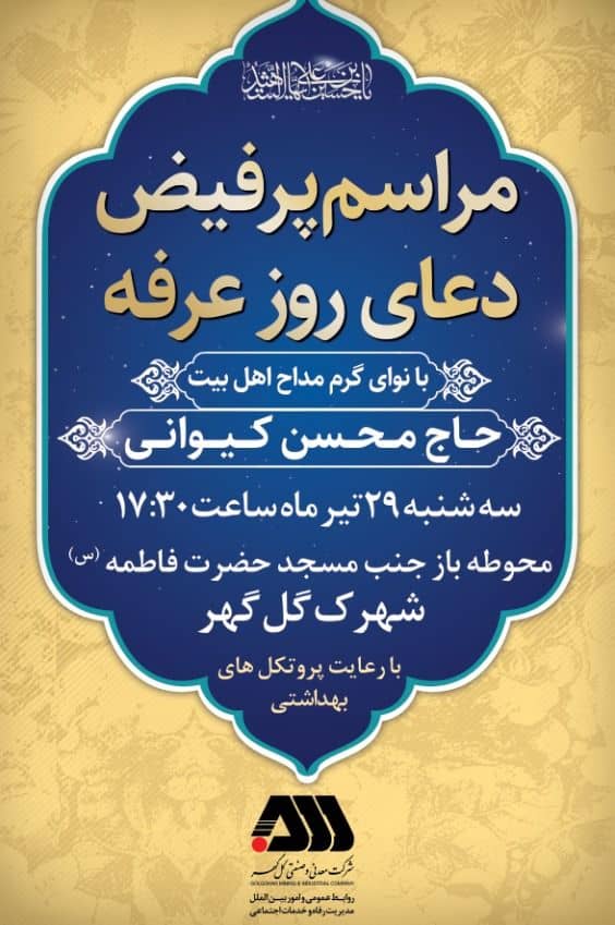 به گزارش روابطعمومی و امور بینالملل شرکت گلگهر، مراسم پرفیض دعای روز عرفه -سهشنبه ۲۹تیرماه- ساعت ۱۷:۳۰ با رعایت پروتکلهای بهداشتی و با نوای گرم مداح اهل بیت(ع) حاج محسن کیوانی در محل محوطه باز مسجد حضرت فاطمه(س) واقع در شهرک مسکونی گلگهر برگزار میشود.