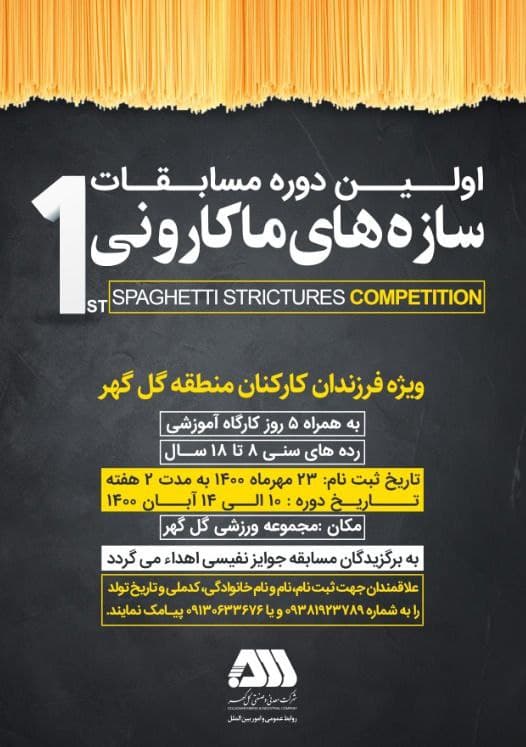 اولین دوره مسابقات سازه های ماکارونی ویژه فرزندان ۸ الی ۱۸ سال کارکنان شرکتهای منطقه بزرگ معدنی و صنعتی گلگهر توسط روابط عمومی و امور بینالملل شرکت گلگهر برگزار میشود.