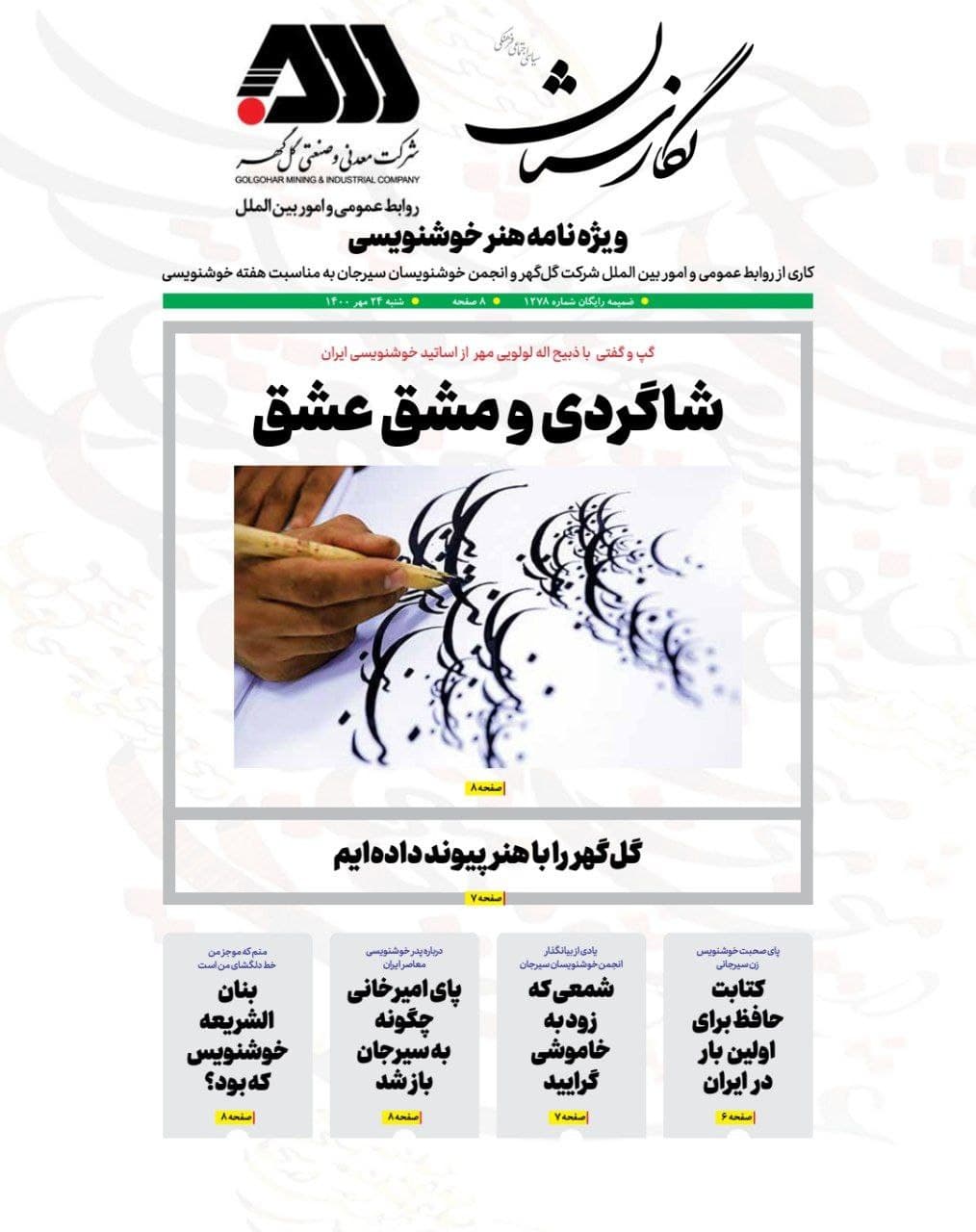 ویژهنامه هنر خوشنویسی به مناسبت گرامیداشت هفته خوشنویسی، ضمیمه رایگان شمارهی امروز هفتهنامه نگارستان توسط روابطعمومی و امور بینالملل شرکت گلگهر و با همکاری انجمن خوشنویسان سیرجان منتشر شد.